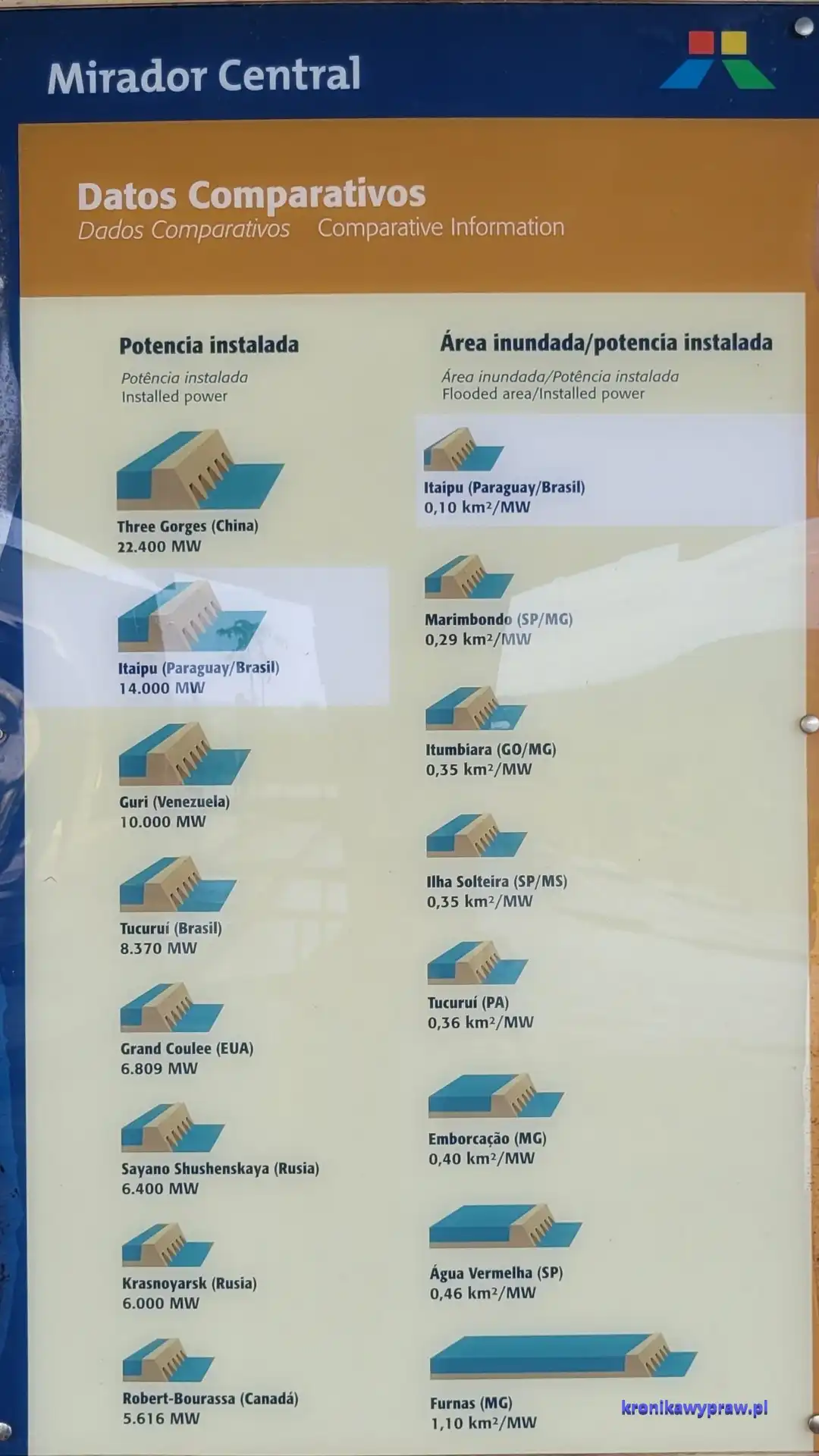 Jednak głównym celem mojej wyprawy tutaj była hydroelektrownia Itaipu. Aby dojechać do Itaipu należy wsiąść do autobusu jadącego do Hernandaríaz i wysiąść przy elektrowni (ok. 15 km). Zwiedzanie jest bezpłatne, należy tylko stawić się w centrum wycieczkowej na odpowiednią godzinę. Wycieczka trwa ok. 1,5 godz. Na początku wyświetlany jest 20 min filmik o historii zapory, jej znaczeniu dla obu krajów, ekologii itp., a po wyjściu z sali projekcyjnej wsiada się do busa, który objeżdża najciekawsze miejsca elektrowni z 1 punktem widokowym (co ciekawe przejeżdża także na stronę Brazylii). Z tego punktu widokowego rozciąga się pełny widok na to gigantyczną zaporę.